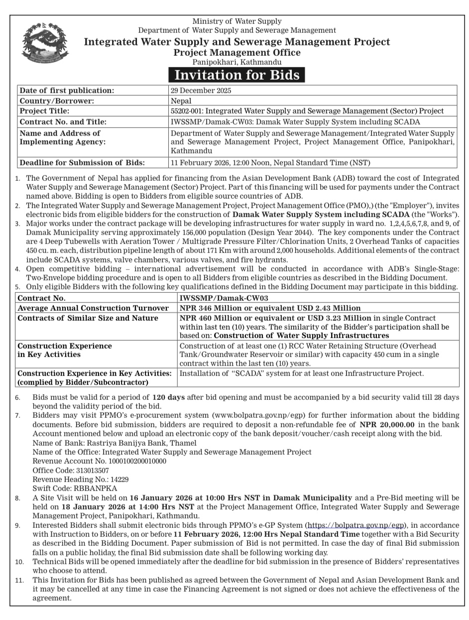 尼泊尔政府水资源供应与污水处理管理部(DWSSM)为“综合水资源供应与污水处理管理项目”中的“达马克供水系统(含SCADA)”工程(合同编号IWSSMP/Damak-CW03)发布国际公开招标公告。