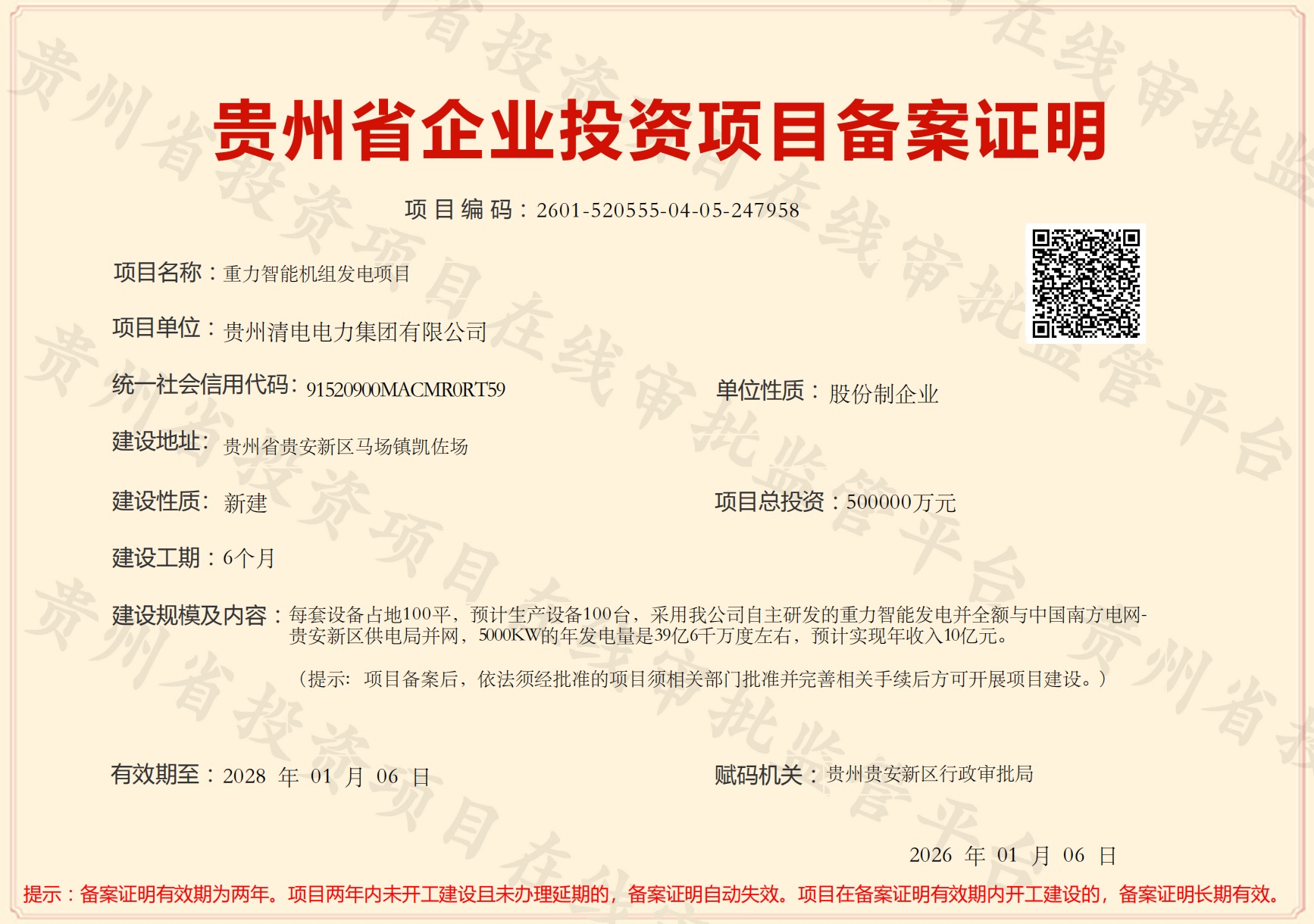 贵州清电电力集团有限公司(以下简称“清电集团”)今日正式宣布,其重磅布局的重力智能机组发电项目已成功取得贵州省企业投资项目备案证明(项目编码:2601-520555-04-05-247958)。该项目总投资50亿元,落户贵安新区马场镇凯佐场,规划部署100台自主研发重力智能发电机组,单机组功率5000千瓦,年运行11个月×24小时,年发电量高达39.6亿千瓦时,按电价0.35元/千瓦时计算,预计年销售收入达13.86亿元,为区域绿色能源转型与AI算力产业发展注入强劲动力。