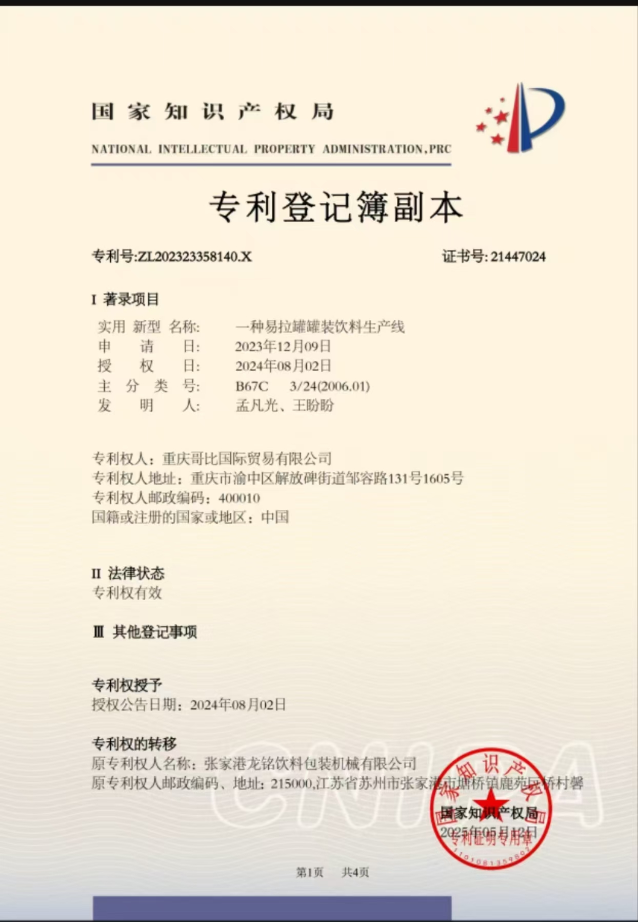 企业自有专利名称 | 易拉罐罐装饮料生产线:CN221459839U 瓶装饮料生产线:CN221296084U | ||